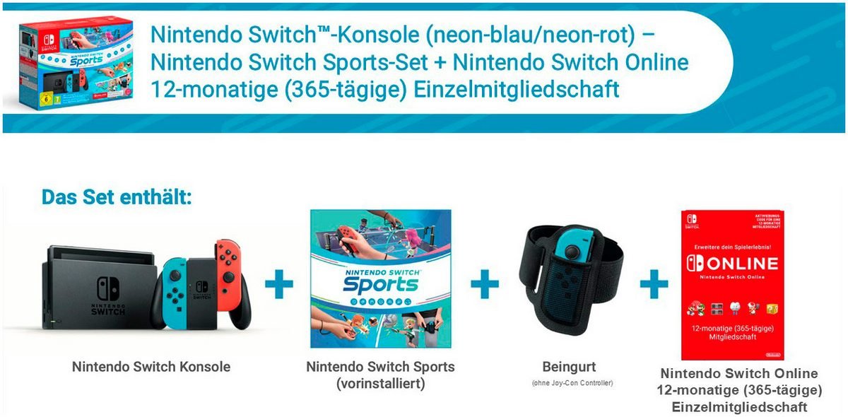 | Lieferumfang | HDMI-Kabel Joy-Con-Controller Joy-Con-Halterung Joy-Con-Handgelenksschlaufen Nintendo-Switch-Netzteil Nintendo-Switch-Station Switch Sports Spiel |